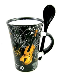 An ideal gift for a violinist or music enthusiast, this black Cappuccino Mug is decorated with a bold pattern featuring the image of a Violin and coffee-related words. A matching spoon, which can be stored in the handle of the mug, is also included. This Cappuccino Mug comes in a presentation box. |